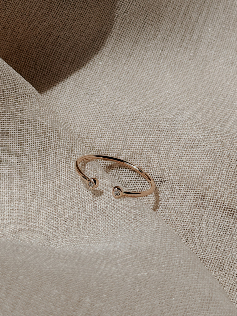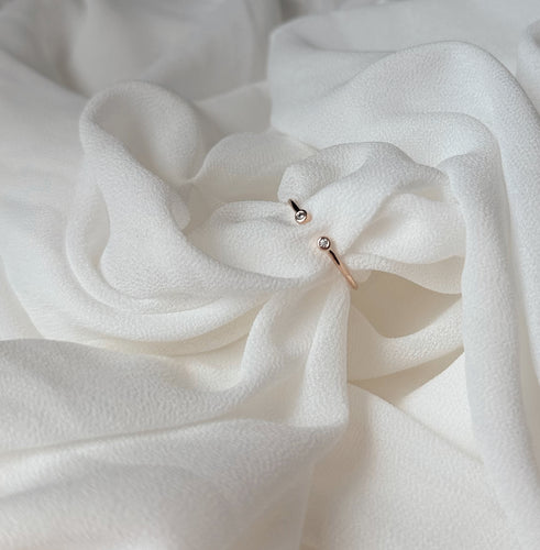 Two stunning Moissanites set beautifully in an open ended ring formation. The Didi is a perfect stand alone piece or can be paired with our Stella or Dina.